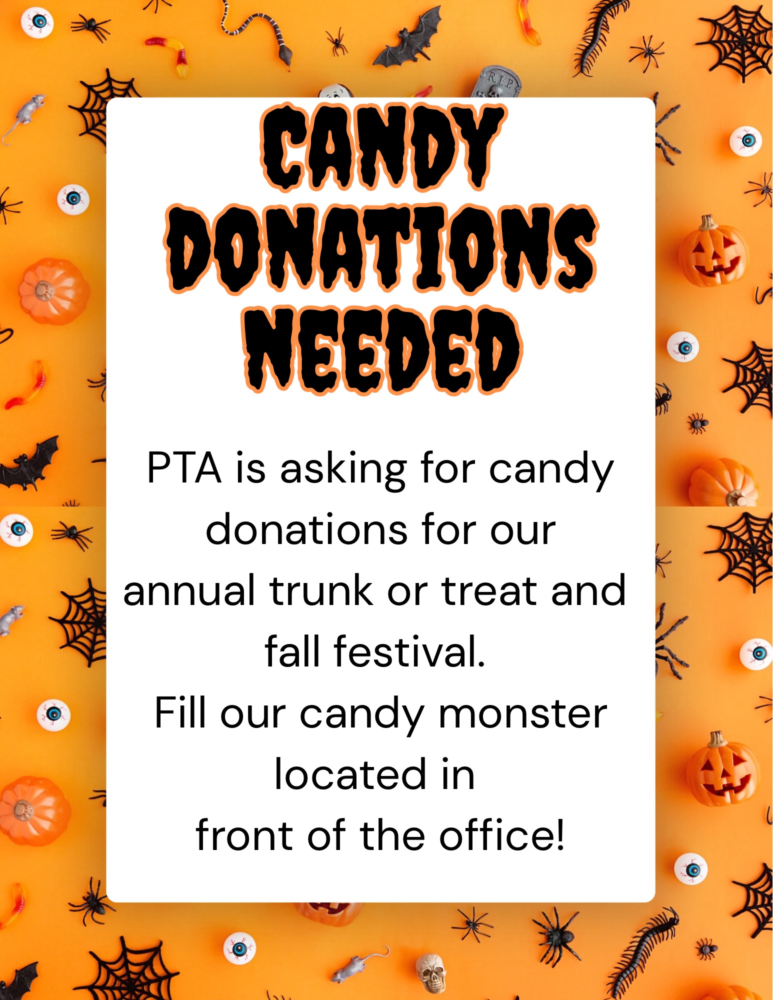 You can drop off your candy donations in our Hangry Candy Monster, located just outside the office during school hours — or feel free to stop by the office directly.
