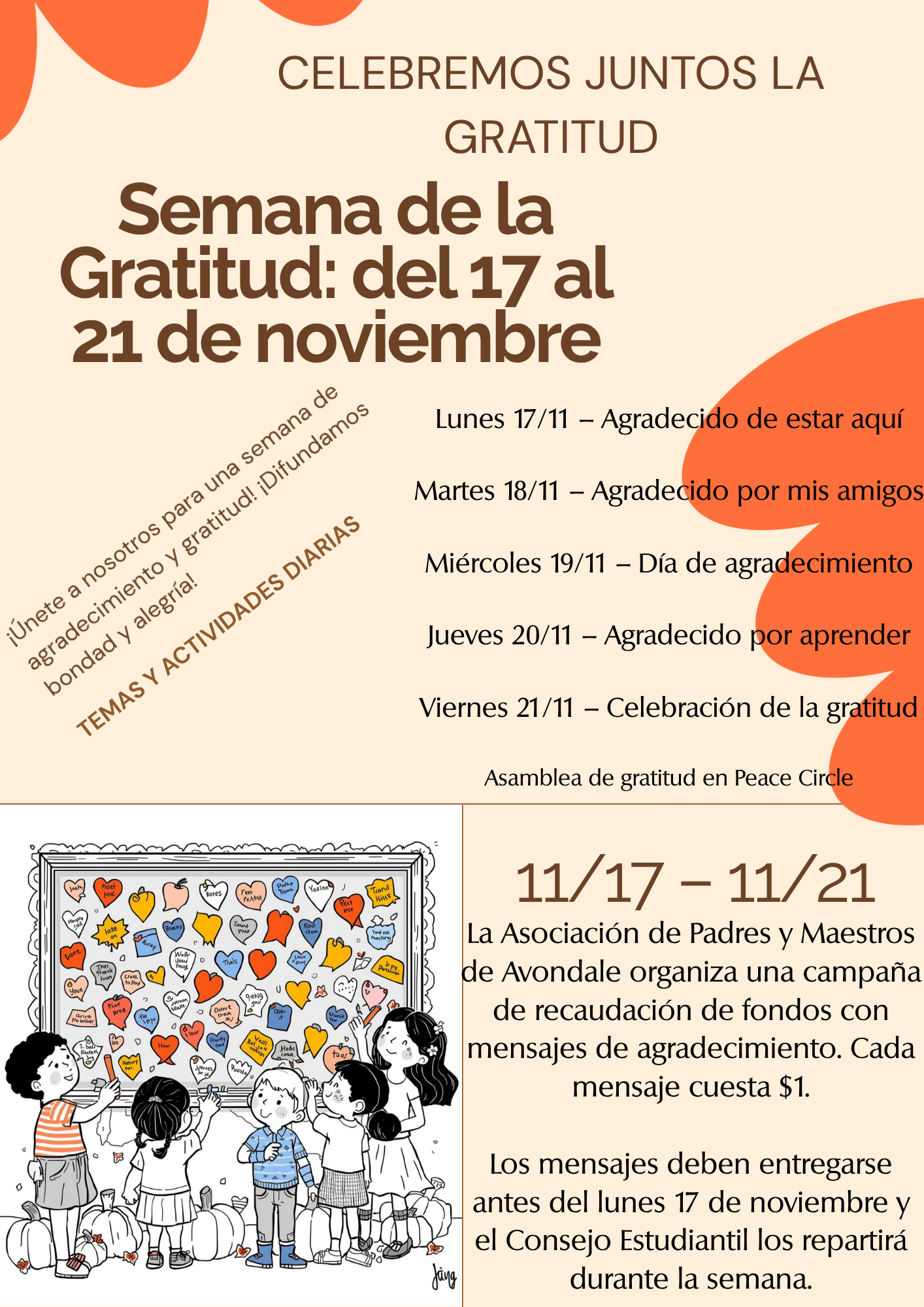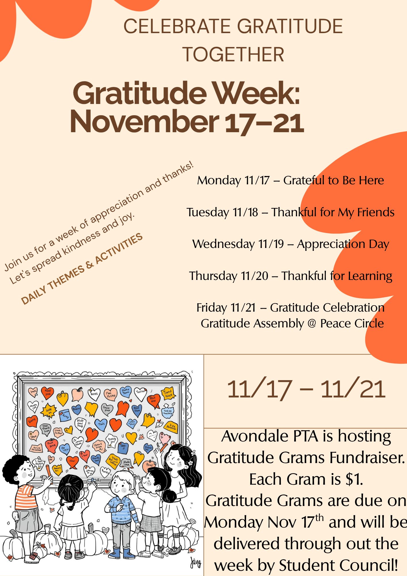 Avondale PTA is hosting Gratitude Grams November 17th – 21st. Each Gratitude Gram is $1 and you can send as many as you would like. The grams and money envelopes will be sent home soon, please be on the look out!