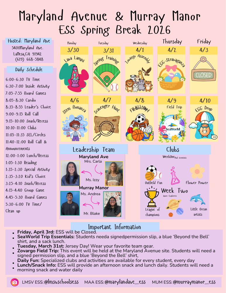 ESS remains operational during Fall, Winter, Spring, and Summer breaks, offering enriching activities and field trips throughout San Diego County.