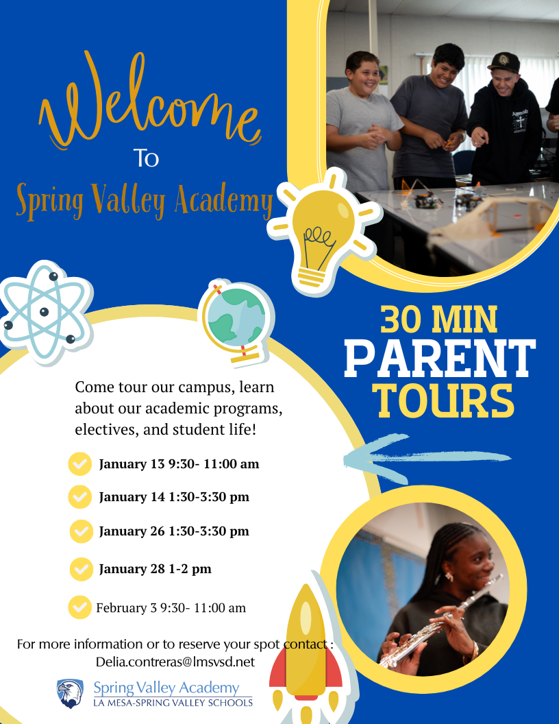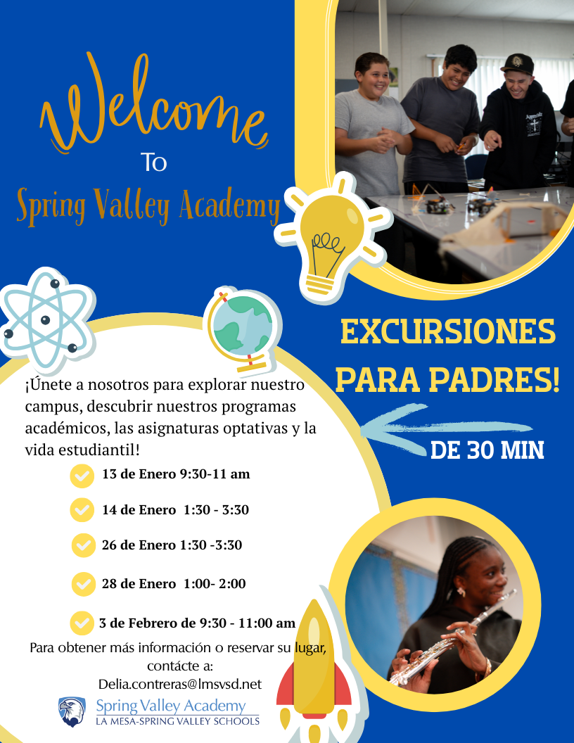 Spring Valley Academy is a middle school program that offers 6th, 7th, and 8th grade in the Casa de Oro neighborhood of Spring Valley. Spring Valley Academy is proud to connect and serve our students and families with caring educators and innovative instruction, preparing them to be successful in high school and beyond. Enroll today!